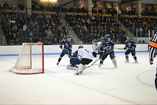 Despite going to the sixth ranked liberal arts college in the country, the announcers call themselves "unintelligent" because they only discover the pronunciation guide for the visiting Corsairs with 15 minutes left in the game. Just a period removed from his first goal as a collegian, Skolnik puts Bowdoin on the PP halfway through the period when he is called for hooking (no, he doesn't go to Yale). Shortly after the Crossairs kill the penalty, Al Milley scores his first goal of the year, a wrist shot in from the point with an assist from Downey. 7:22 to go. Continuing the trend of Bowdoin penalties after goals and the Skolnik Corrolary of getting a penalty after your first goal of the year, Milley gets called for charging with 5:24 remaining.